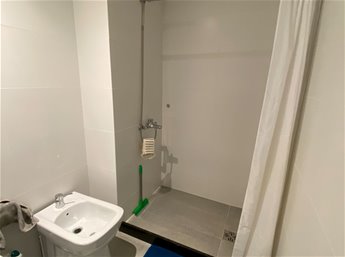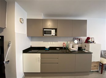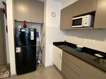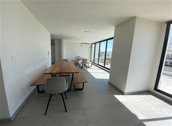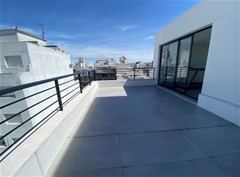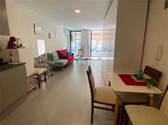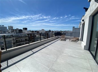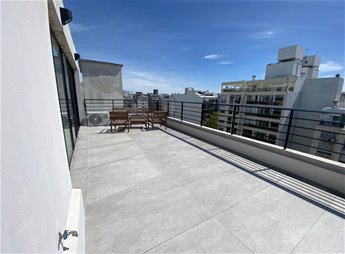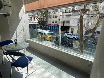 Al frente, terraza de 5m2 y ambiente de 30m2 con kichinette integrada, equipado con placard, cocina vitrocerámica empotrada, microondas, heladera y calefón, baño amplio.