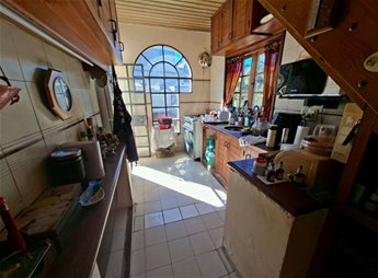 Cocina muy soleada con profusión de placares y acceso desde allí al patio con espacios verdes y con hermosa barbacoa con parrillero.